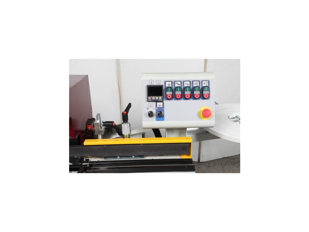 ● Stroj vhodný pro desky s rovnými hranami s automatickým podáváním. Lepidlo se nanáší přímo na dřevěné nebo plastové hrany v rolích o tloušťce do 3 mm a na pásy o tloušťce do 4 mm.