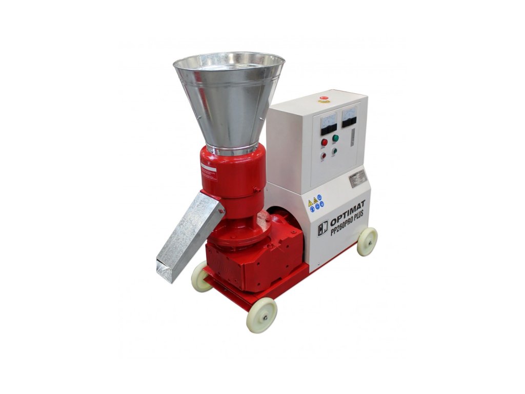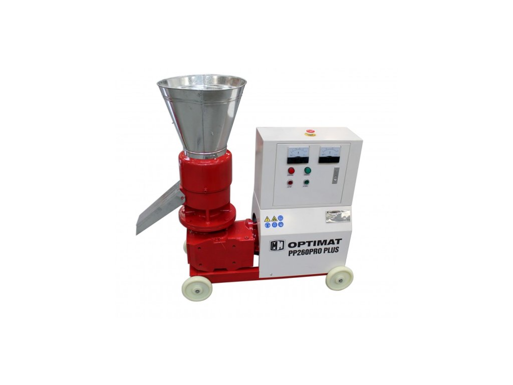 Průmyslový lis na pelety polské značky Optimat, model PP260PRO, na velké množství granulátu v krátkém čase, skvěle funguje pro výrobu pelet z organických materiálů, které lze použít k vytápění a hnojení a jako krmivo pro zvířata.