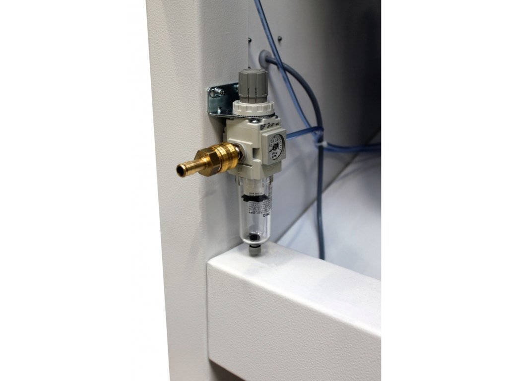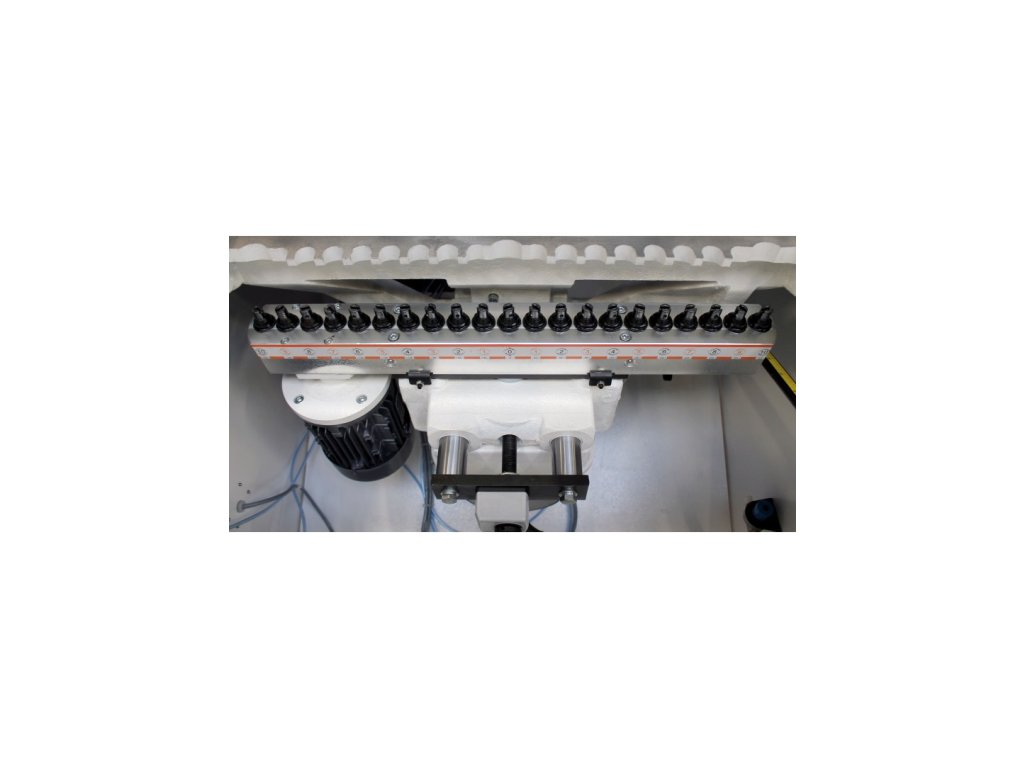 Vícevřetenová vrtačka s nejvyšší přesností vrtání. Má stabilní pracovní stůl vyrobený z litiny. Pneumatická naklápěcí hlava v úhlu 90° až 0°. Stabilní boční dorazy a pneumatické upínače.